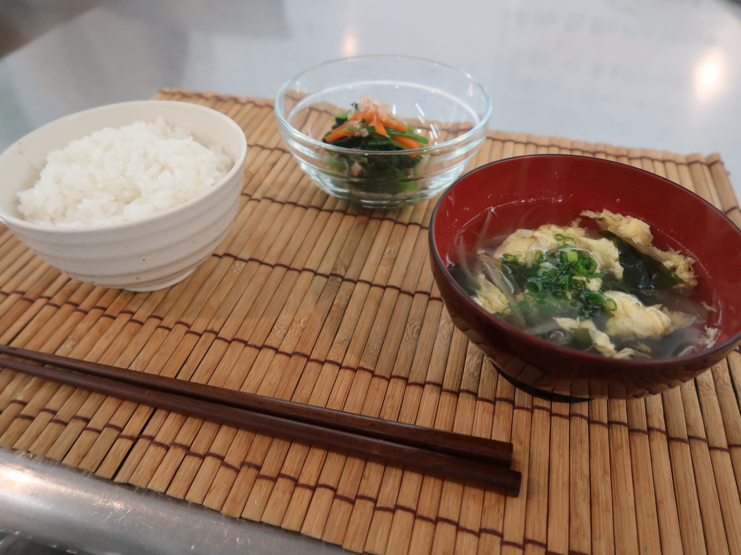 今日の1年生調理実習は、鍋炊きごはん ほうれん草お浸し かきたま汁